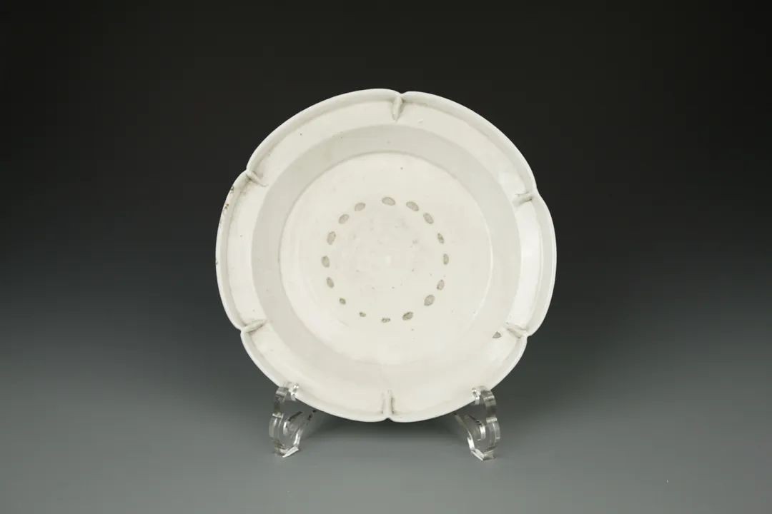 折沿盘属浑源窑,折沿,圆唇,六瓣花口,圈足。沿内折向里处皆有凸棱,内底有支钉痕十六个。白色胎,质坚硬。白釉,圈足凹面不挂釉。圈足底面支钉痕为十五个。因为釉在高温时发生熔融,经化学变化后变成的半透明玻璃质物质,如果满釉入窑烧制,会使器皿底部粘住窑炉,不易取下,所以器皿底部是通常不挂釉。后来人们为了追求满釉的完美品相,就发明了支钉以便解决这一问题。釉也粘支钉,但是支钉面积小,待出窑之后,用东西敲下去即可。所以底部满釉的器皿通常会有支钉痕迹。