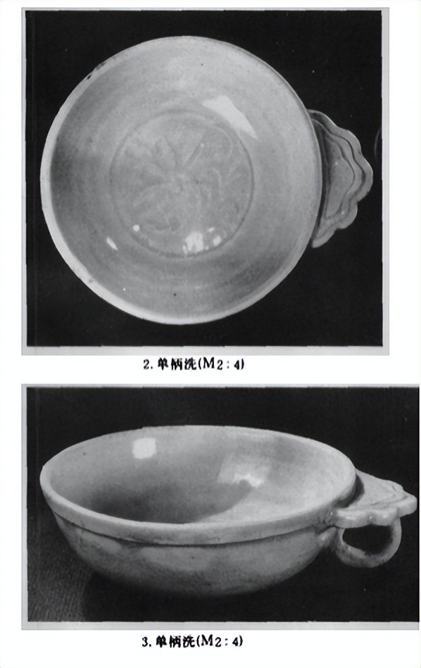 单柄洗在金代发现的数量较多,如平谷县东高村巨家坟泰和三年金墓中出土了一件压手为如意形的黄釉单耳洗。乌古论窝论墓中出土了两件月白釉单耳洗,其中一件保存完整;素面,胎为灰白色,胎质细腻,胎上施一层白色护胎釉。器身内外施釉,釉色白中闪青,色泽明亮细润,有细小开片。