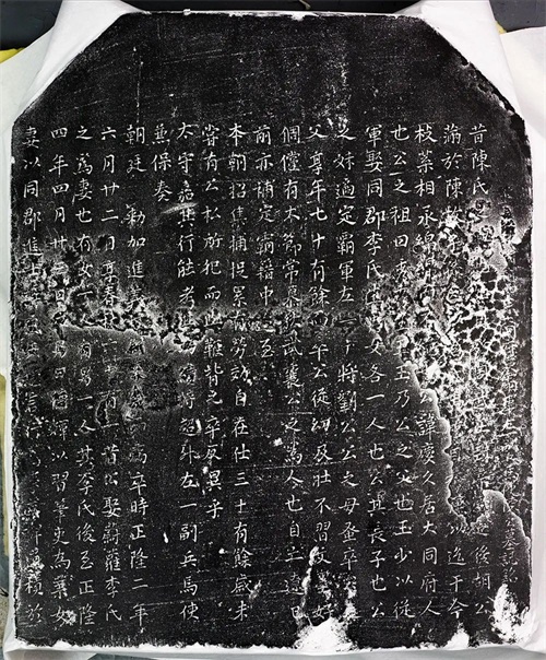 进义校尉前西京大同府定霸军左一副兵马使陈公墓誌铭」昔陈氏之兴也始自于周武王封帝□之后胡公」满于陈故子孙因以为氏焉历自秦汉以迄于今」枝叶相承绵绵而不绝也公讳庆久居大同府人」也公之祖曰秀秀生玉玉乃公之父也玉少以从」军娶同郡李氏生男女各一人也公其长子也公」之妹适定霸军左一□将刘公公之母蚤卒公之」父享年七十有余而卒公从幼及壮不习文墨好」倜傥有大节常慕狄武襄公之为人也自亡辽己」前亦补定霸籍中迨至」本朝招集捕捉累有劳效自在仕三十有余岁未」尝有公私所犯而兴鞭背之卒反异乎」太守嘉其行能考其功绩□超外左一副兵马使」兼保奏」朝廷敕加进义校尉未几而病卒时正隆二年」六月廿二日享春秋六十有一昔公娶蔚萝李氏」之为妻也有女一人有男一人其李氏后至正隆」四年四月廿三日卒男曰德辉以习笔吏为业女」妻以同郡进士许生夫懋言行□事□□□积于」。