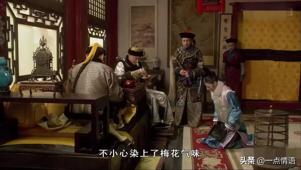皇上问她,茶是不是用倚梅园梅花上的雪水泡的。余莺儿立刻跪下说是自己昨夜不小心染上了梅花的气味。