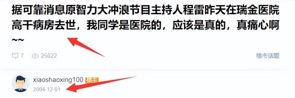 早在2004年,程雷就被造谣过去世,就连去世地点都和这次造谣的地点一样,都是在上海瑞金医院。
