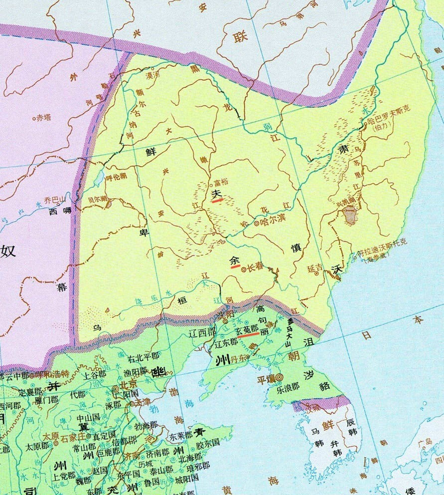 扶余国,在玄菟北千里。南与高句丽,东与挹娄,西与鲜卑接,北有弱水。地方二千里,本濊地也。——《后汉书·东夷列传》