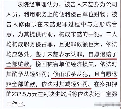 在法庭审理的时候,宋喆表示自己很后悔,并且主动退还了私自侵占的款项,所以他被从轻处罚了。