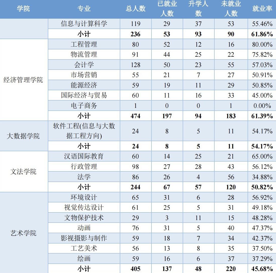 2021年就业质量报告没出,小编就找了前一年也就是2020年的就业质量报告。2020届毕业生的就业质量报告显示,截至 2020 年 11 月 20 日,该校2020届本科毕业生就业率为 67.37%,比2021年截至时间点晚,但是比率更低,两年间没有大起大落,说明该校的统计方法保持了前后一致。