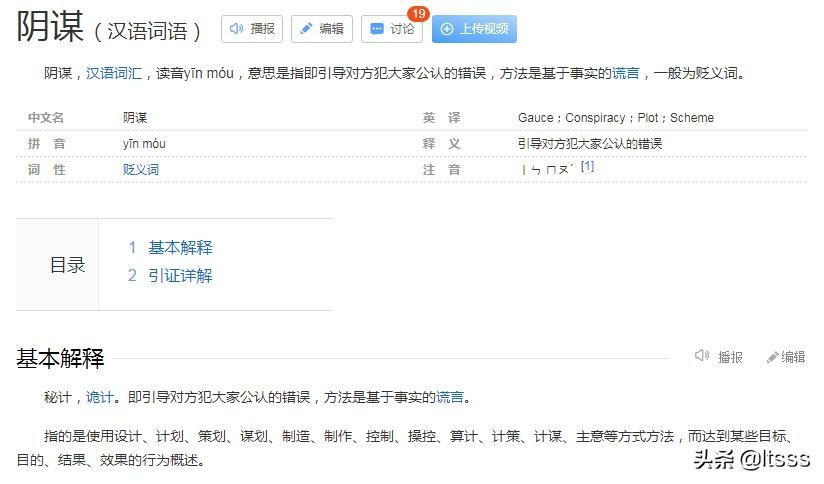 我们不妨百度一下“阴谋”一词。”阴谋“的基本解释:秘计,诡计。即引导对方犯大家公认的错误,方法是基于事实的谎言。指的是使用设计、计划、策划、谋划、制造、制作、控制、操控、算计、计策、计谋、主意等方式方法,而达到某些目标、目的、结果、效果的行为概述。