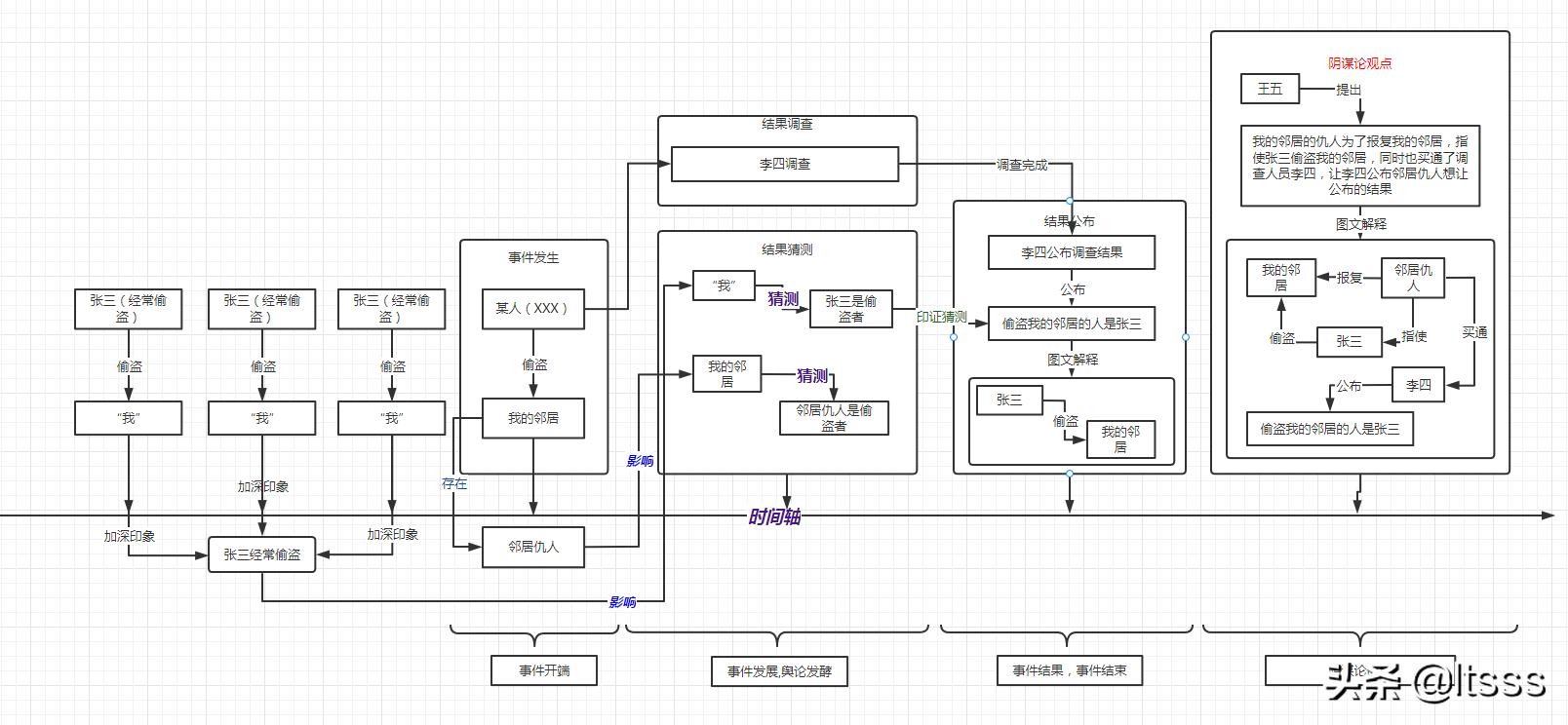 张三经常偷盗,同时“我“也经常被张三偷。有一天,我的邻居被偷了。事件调查交给了一位自称”公平公正“的李四来调查,预计调查时间需要很久。那么,在调查结果公布之前,”我“因为经常被张三偷,所以我有了应激反应,本能地认为”偷盗之事皆为张三所为“,所以做此猜测。但是,我的邻居不这么认为,他说他有一个仇人,他猜测”偷盗他的人是他的仇人“。那么等到调查结果公布,自称”公平公正“的李四公布调查结果:偷盗我的邻居的人是张三。这个结果刚刚好对上“我”的猜测。应该注意的是公布的结果未必是客观事实真相。公布结果之后,机智王五认为事情存在蹊跷,他提出新的观点,他认为:“我的邻居的仇人为了报复我的邻居,指使张三偷盗我的邻居,同时也买通了调查人员李四,让李四公布邻居仇人想让公布的结果“。
