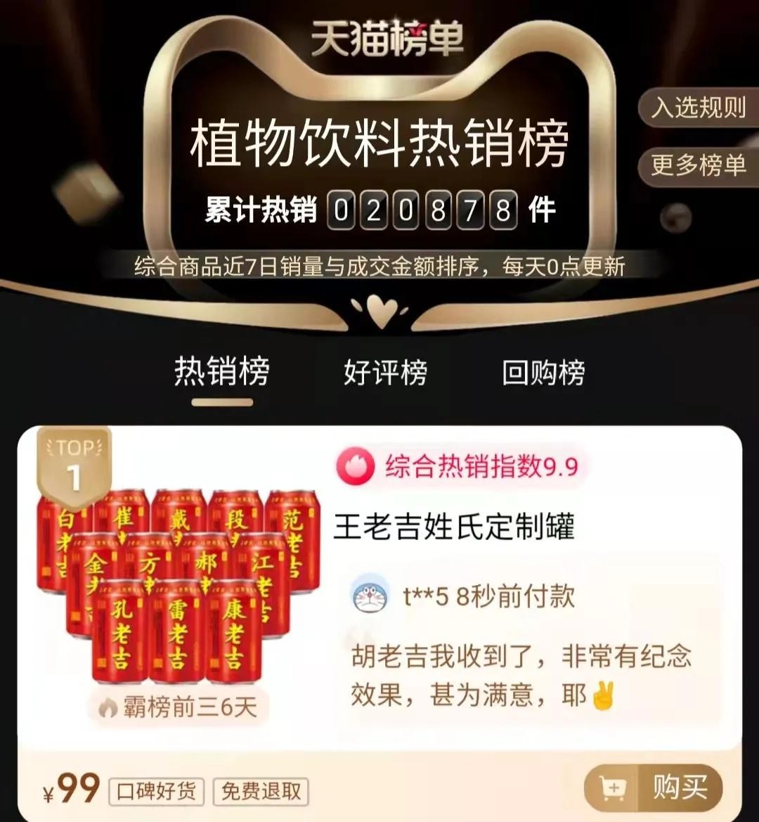 在天猫植物饮料热销榜中,王老吉姓氏定制罐成功登上第一名,月销量超过9万箱。