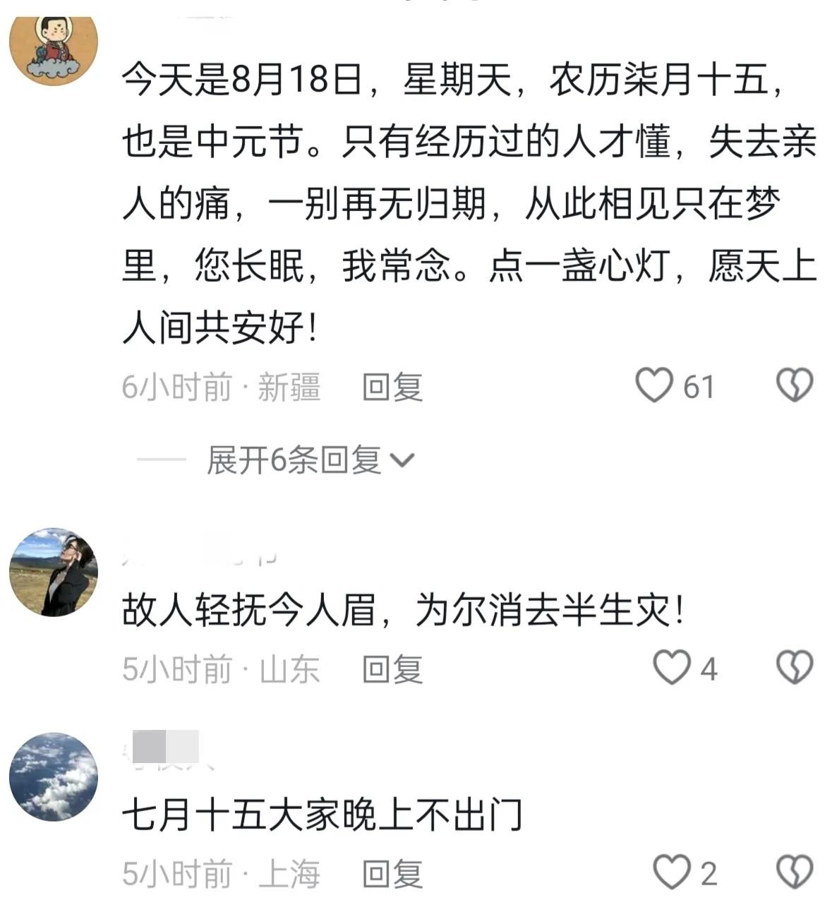总之,中元节是7月半,也是俗称的“鬼节”。更多却是自古至今的用来思念亲人,思念已故的去远方亲人的日子。