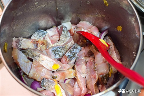 看看我这一大桶鱼肉吧,用洋葱、料酒、盐、生姜把鱼肉腌上。鱼肉一定要先洗后切,这样不会带太多水份。