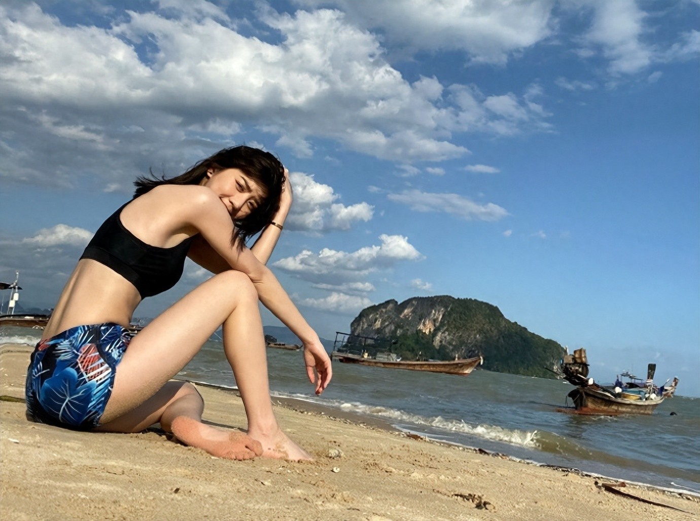 李凯馨沙滩美照:吊带背心热裤身材纤美,静享阳光海滩好风光