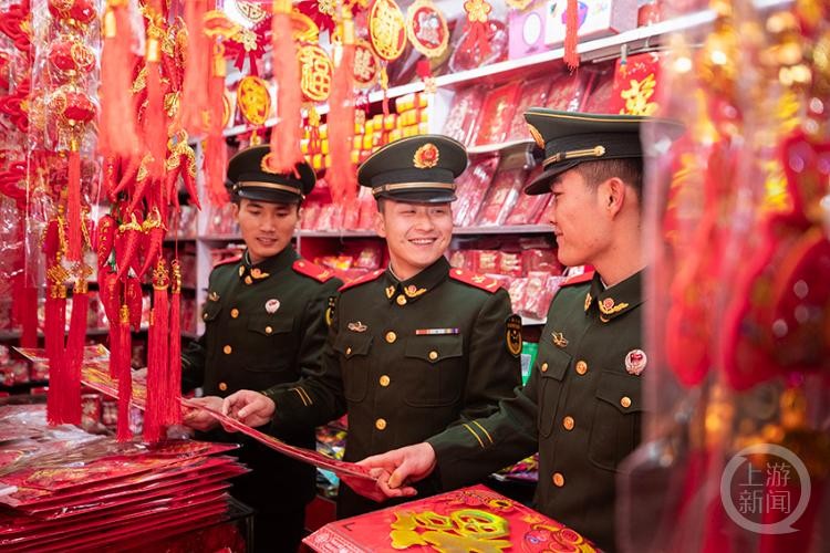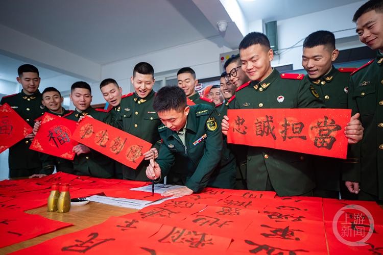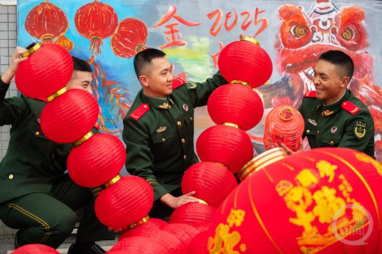 营区内,官兵们分工明确,火红的灯笼、吉祥的中国结、手写的春联,把军营装扮得喜气洋洋、年味十足。