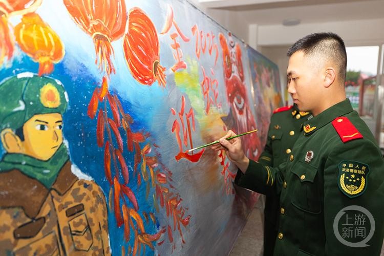 官兵画黑板报迎接新年。