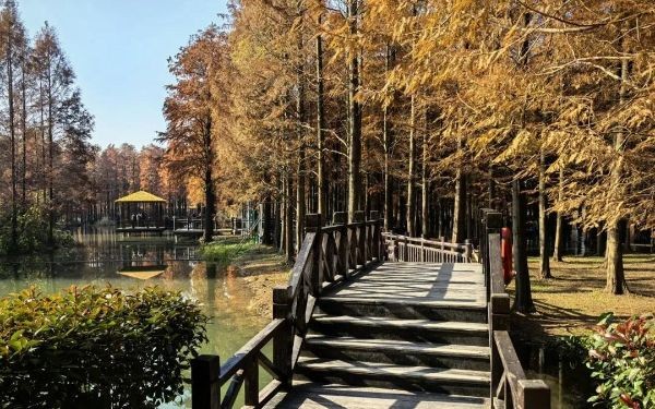 青西郊野公园位于青浦区,是一个兼具自然美景与生态保育的“城市绿洲”。水上森林覆盖面积超过60亩,栽种着2800余株池杉。每年秋冬季节,随着气温降低,树叶由绿转黄、转红,如同被大自然的画笔染上了浓烈的色彩。尤其是清晨和黄昏,枝叶与倒影勾画成梦幻般的画面,白鹭翻飞,水波荡漾,一派宁静风光。