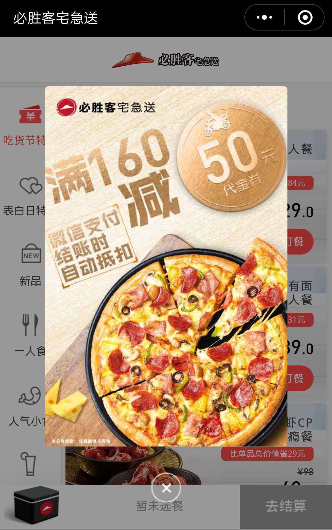 优惠券分为线上使用和到店使用两种,线上即在微信小程序直接下单,到店就是直接在实体店使用扫码付款。笔者选择必胜客,点击进入页面,显示满160减50元消费券,在结账时选择微信支付自动抵扣优惠券金额。支付完毕后自动弹出摇一摇抽奖免单。