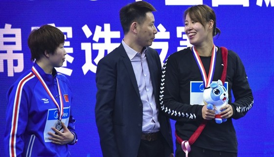 赛后,傅园慧和友人热聊,心情大好,笑容灿烂。