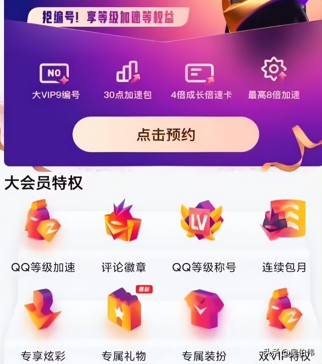 腾讯 QQ 的大 VIP9 包含突破版、超越版、次世代版等诸多版本。其中,突破版需要 788 元永久激活,其具备唯一编号,还拥有 6 个月的 30 点加速包、6 个月的 4 倍成长倍速卡以及 7.1 倍的 QQ 加速等权益;超越版则是 1188 元永久激活,同样拥有唯一编号,同时配备 9 个月的 30 点加速包、9 个月的 4 倍成长倍速卡以及 7.3 倍的 QQ 加速等内容;而次世代版需要 1888 元永久激活,拥有唯一编号,并且附带 12 个月的 30 点加速包、12 个月的 4 倍成长倍速卡以及 8 倍的 QQ 加速等优势。目前,相关预约已经开启。