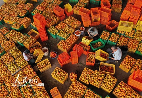 2023年10月18日,在广西桂林市恭城瑶族自治县嘉会镇泗安村,月柿丰收上市,村民加紧精选、去皮加工和晾晒,供应市场。刘教清摄(人民图片网)