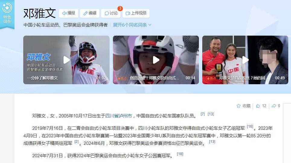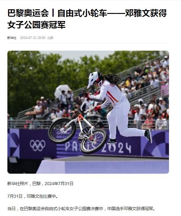 据了解,巴黎当地时间7月31日,举行了自由式小轮车女子公园赛决赛,我国小轮车运动员“邓雅文”获得冠军,她的教练是东京奥运小轮车项目银牌获得者,这也验证了名师出高徒的说法。虽然小轮车运动员不是我国奥运会强项,但是我们在巴黎奥运会上却做到了,暂获一枚金牌。