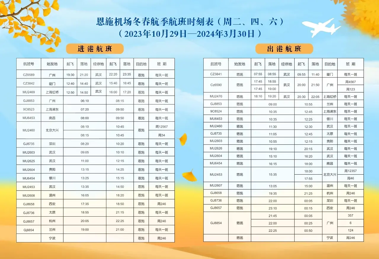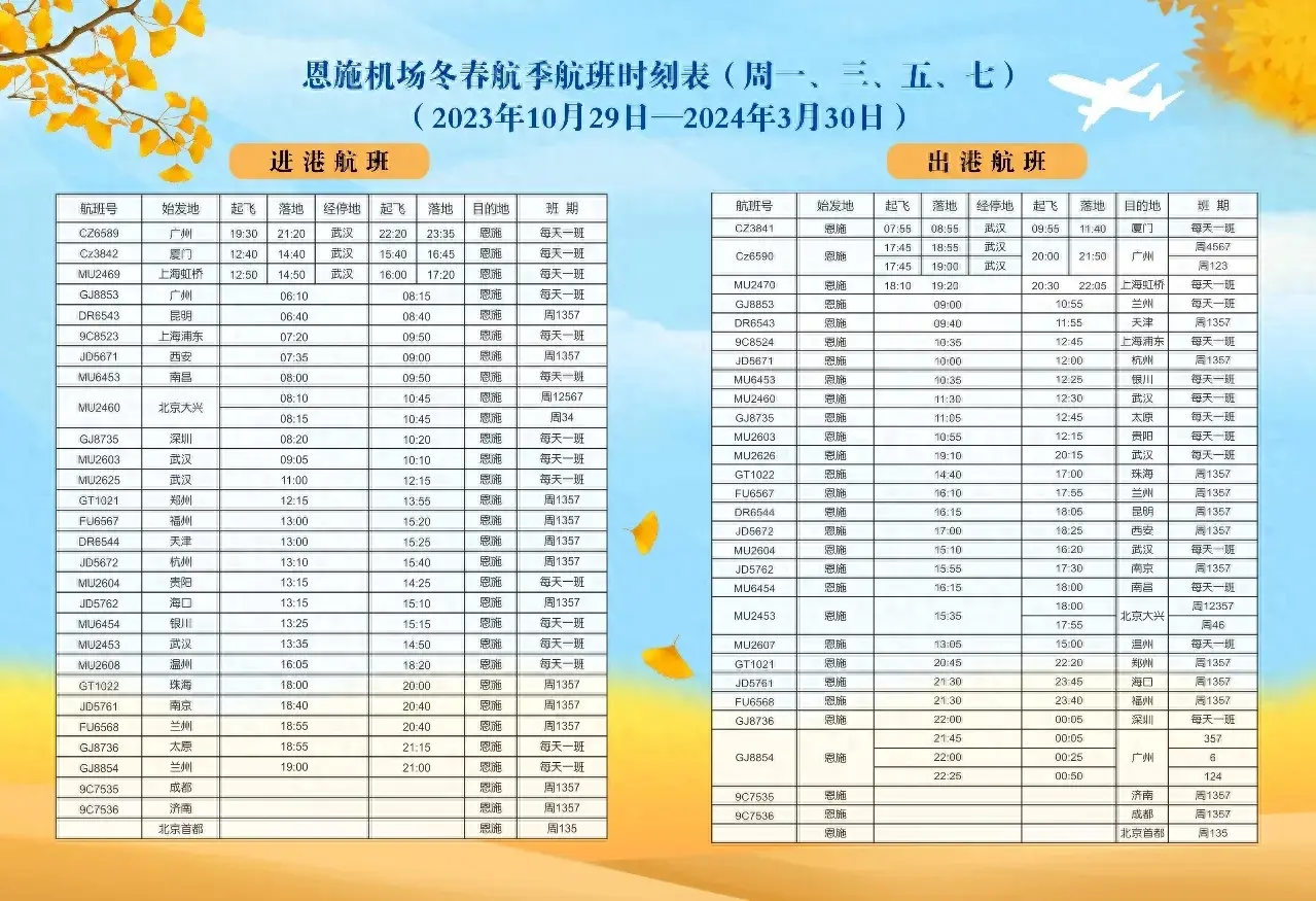 记者从恩施机场获悉: 10月29日-3月30日,恩施机场将执行2025年冬春季航班计划。换季后,恩施机场将开通19条航线,通航24个城市,分别是北京、上海、广州、深圳、厦门、杭州、西安、太原、西宁、海口、南京、武汉、贵阳、珠海、温州、郑州、天津、昆明、兰州、福州、南昌、银川、成都、济南等城市。