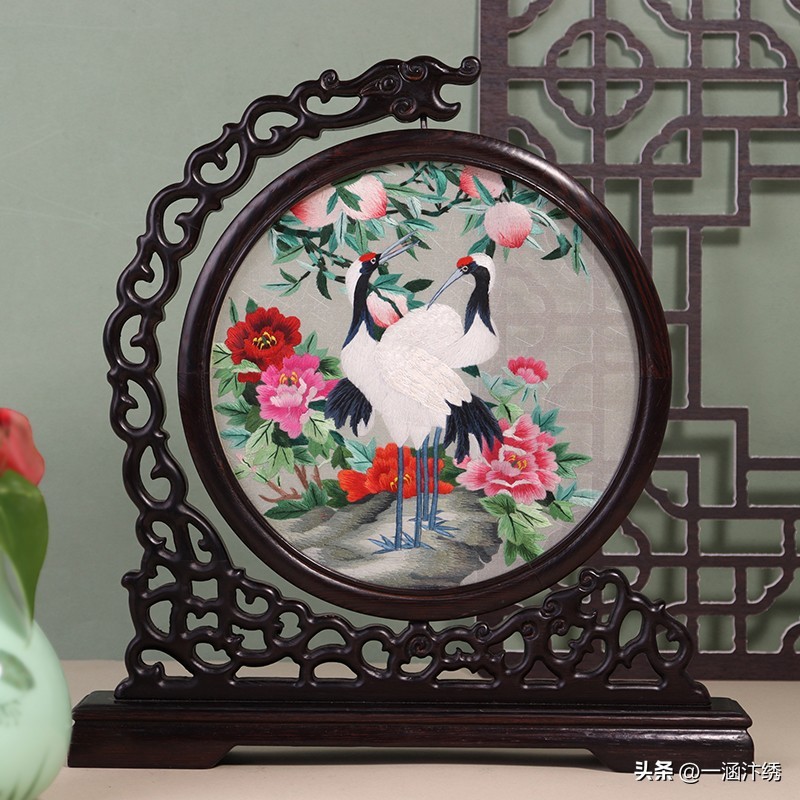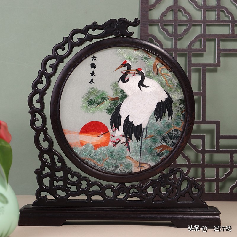 在老一辈的观念里,松树、仙鹤、蟠桃都是健康长寿的象征。这款祝寿题材的双面绣摆件,以精湛的刺绣技艺,将仙鹤、青松、蟠桃等绣制得栩栩如生,观之端庄大气,画面内容丰富秀丽,色泽鲜艳。仙鹤展翅欲飞,青松挺拔苍劲,蟠桃挂满枝头,寓意着松鹤延年、松鹤长春、双鹤献瑞。作为祝寿礼物,摆放在家中,不仅雅致美观,还能为老人带来吉祥与长寿的美好祝愿。