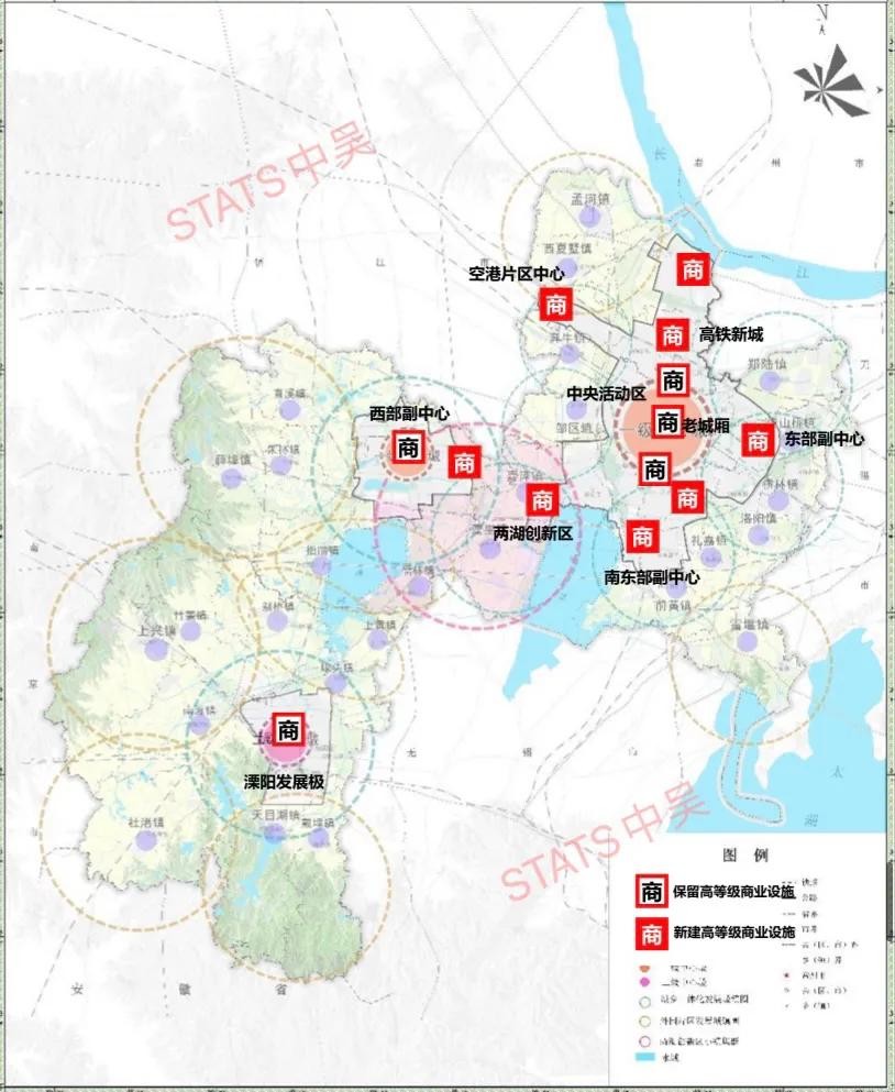 振兴老城厢,促进商业设施向中央活动区、高铁新城、 东部副中心、南部副中心、西部副中心、两湖创新区、溧阳发展极集聚。
