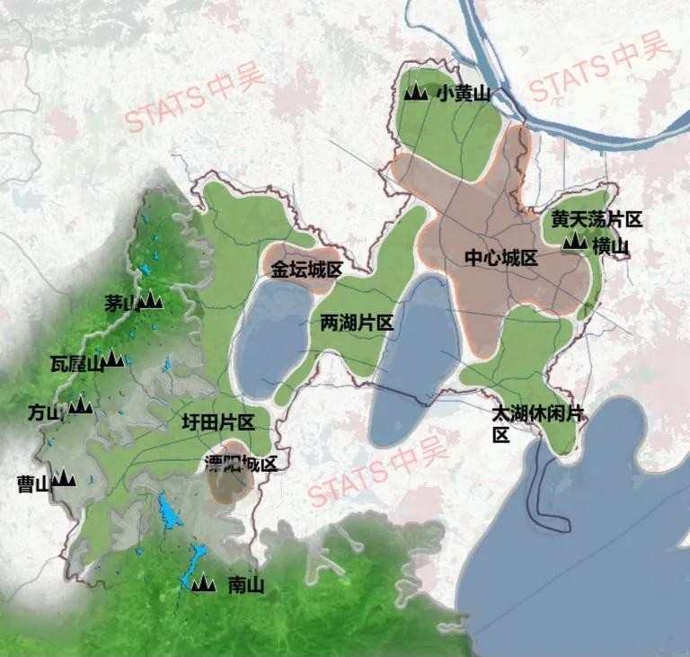 中心城区:市辖区城镇开发边界内规划的集中建设连绵区,面积约724平方公里。