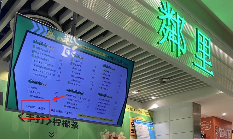 鄰里的 LED 电子屏显示冰度推荐选项为 " 正常冰 "" 少冰 ",该店广告声称 " 冰越多,味特浓 "。