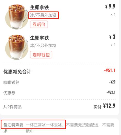 瑞幸咖啡小程序都没有设置冰量选项,消费者若有需求须下单时备注 " 少冰 "、" 去冰 " 等要求。