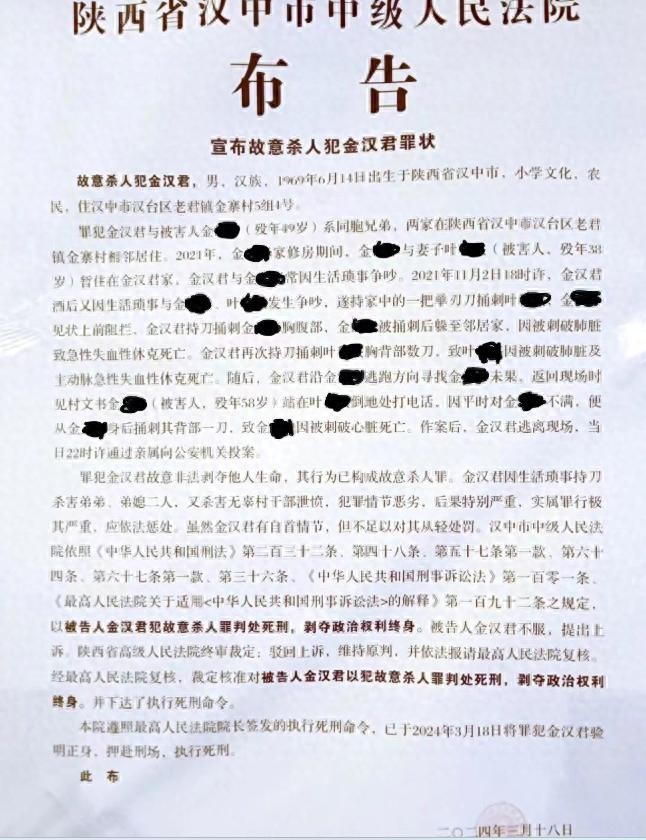案发后,金汉君潜逃,当晚10点才在亲属的劝说下投案自首。虽然他到案速度较快,但凶残的犯罪手段和严重的后果,还是让他难逃法网。汉中中院一审判处其死刑,陕西高院二审维持原判,最高法复核后核准了这一判决。