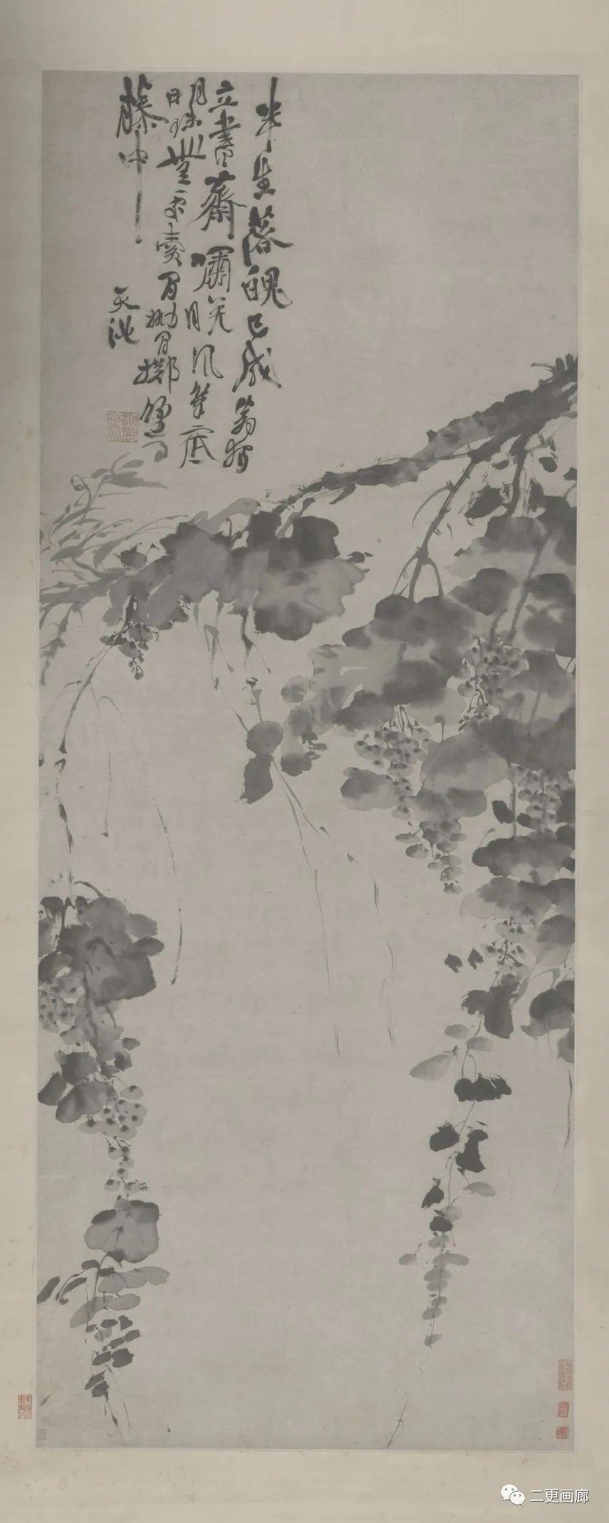 ▪️徐渭,字文长,号青藤道士,浙江山阴人。他对社会的种种不平怀有切肤之痛,形成了狂傲不羁的个性。同时,他修养广博,诗、书、画无所不能,尤擅狂草,精通民间戏曲,并深受以个性解放为实质的新思潮的影响,故在写意花鸟画创作中能够空诸依傍,别开门户。一改吴门画派花鸟画自然秀润、恬静优雅的格调,而形成大胆泼辣,乱头服的画风,并结合题诗及苍劲奔放的书法,从中表现他倔强不驯的个性。代表作有《牡丹蕉石图卷》《墨葡萄图》,徐渭的绘画糅合了墨葡萄不同的文化含义,将之塑造成为个人精神的象征物。是明代水墨写意花卉画家中,革新精神最强,最为突出的画家。