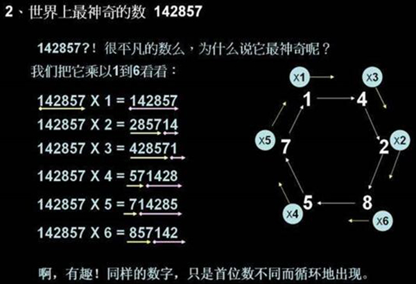 在数字1142857被创造的时间,许多人都闭于这一串数字的构成百思而没有得其解,有许多人闭于这一组数字干了仔细的分解与简直的运算,得出这一组数字自身即说明白一个礼拜七天的存在,与此共时也说明白昔人的聪明是无穷无尽的,这一组数字就是昔人聪明的结晶。