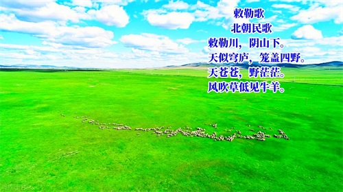 在高峻的阴山脚下,有个敕勒族生活的大草原。敕勒川的天空,四面与大地相连,看起来像一顶宽大无比的蒙古包,笼罩着四面八方辽阔的原野。蓝天下的草原啊,翻滚着绿色的波澜,风吹过来草低头,一群群的牛羊时隐时现。