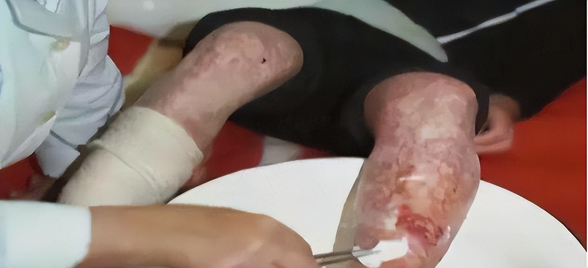 第七天,皮肤开始掉落,护士换绷带一拉,皮就一块块掉,底下全是血肉。