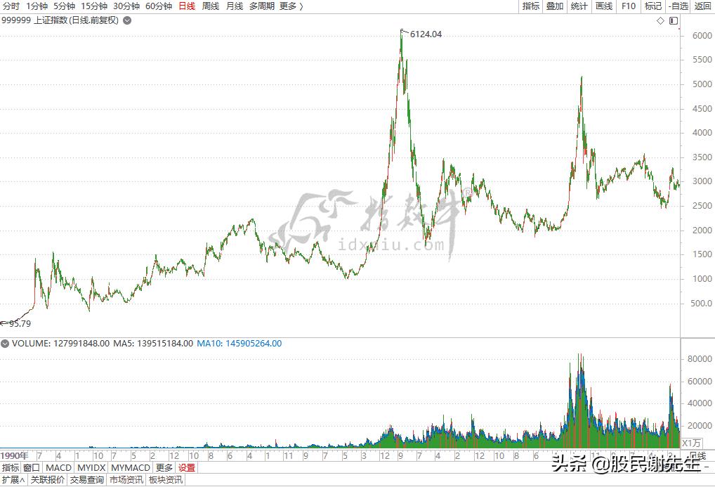 从上面上证指数走势图日K线图中能够看到自上证指数发布以来的所有日K线,下面幅图中是成交量(VOL)指标,是不是可以从这个指标中看出些问题?对,绿色面积明显多于红色面积,这就是大家常说的“熊长牛短”,即熊市时间长,牛市时间短。为什么会这样?这里简单说几句吧,在熊市里,主力需要出货,而出货的速度必须慢,否则股价很快就砸下去了。而在牛市里,主力需要散户的激情来抬轿,速度必须快,只有快速的赚钱效应,散户才会不惜成本地买入股票。