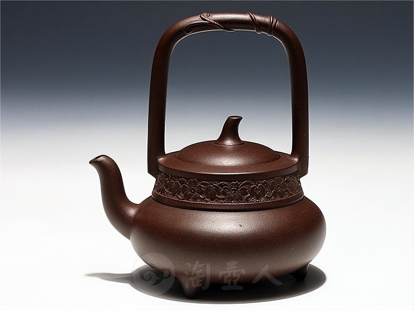北瓜提梁壶,为高海庚设计,周桂珍制壶,壶颈一圈由毛国强大师雕刻花纹装饰。壶颈高,云肩,身扁,偏腹鼓,瓜柄钮,盖形简洁流畅,口盖稳合严密,壶底带三小足。壶把以圆角方形提梁高悬壶体正上方,线条飘逸优美。