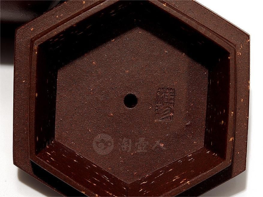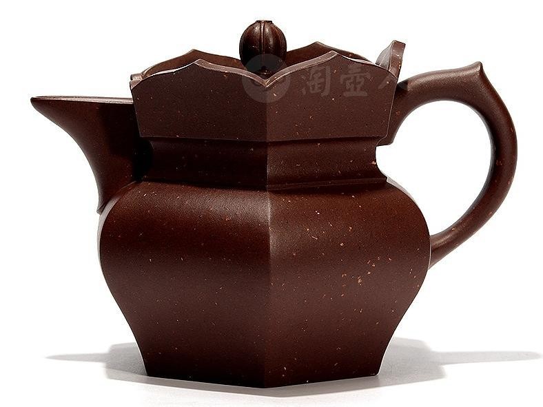 六方嵌盖隐于帽沿内,任意调动,口盖均严丝合缝,中置一钮作莲子状,六条筋纹清晰分明。壶流颇具特色,帽沿其中一片莲瓣化作鸭嘴形流,与盖面平齐,与飞鋬相呼应,整体视觉效果和谐美观。整器无论泥料、容量,还是尺寸、细节,皆和顾老经典僧帽相差无几,可见作者对泥料泥性的掌握、对镶接工艺的熟悉程度、对繁复方器的驾驭能力,非同一般。
