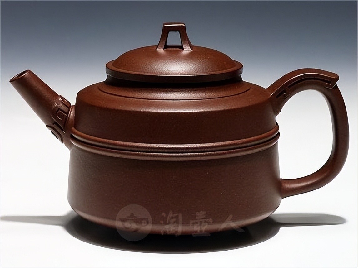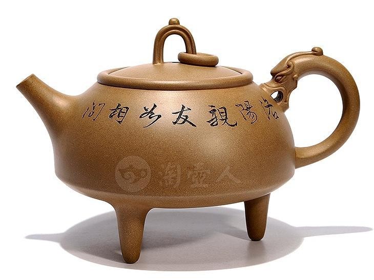 造型简练大方,圆柱壶身,仿商周青铜鼎为形,饰一条皮带线,线条流畅自然。短直流饰以青铜纹饰,环耳把饰一截飞龙。下置三钉足,高高托起壶身。壶钮为方形桥钮,与整器呼应。