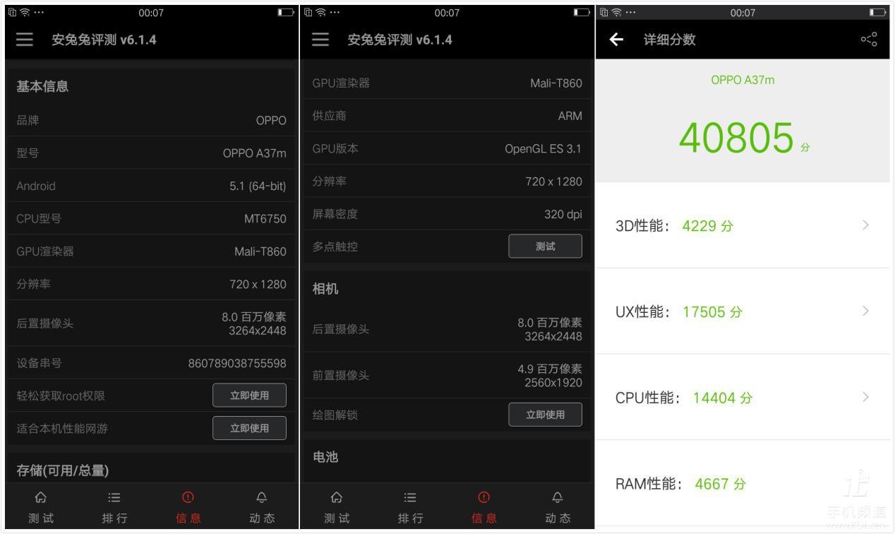 说到手机软件的跑分,国内知名的跑分软件安兔兔数据库收录的成绩为40000左右。OPPO A37运行MT6750八核64位处理器,16GB的机身空间存储容量,最大可支持128GB内存扩展,还是比较厚道的,满足一般上网的需求,如:刷微博,购物等活动还是绰绰有余的;游戏方面,玩一般的单机游戏,斗地主和开心消消乐是十分的流畅,画面感和饱和度也算得上该有水准,但要是玩起来大型的游戏难免掉帧厉害,发热量也变得大了许多,考虑到这只是一款入门型的手机,受成本的限制,也就见怪不怪了。续航方面,该机电池为2630mAh,理论续航时间可以达到15小时,实际上辅助Color 0S3.0的省电技术和联发科芯片低功耗的特点,可以满足学生党和上班族正常的使用一天。