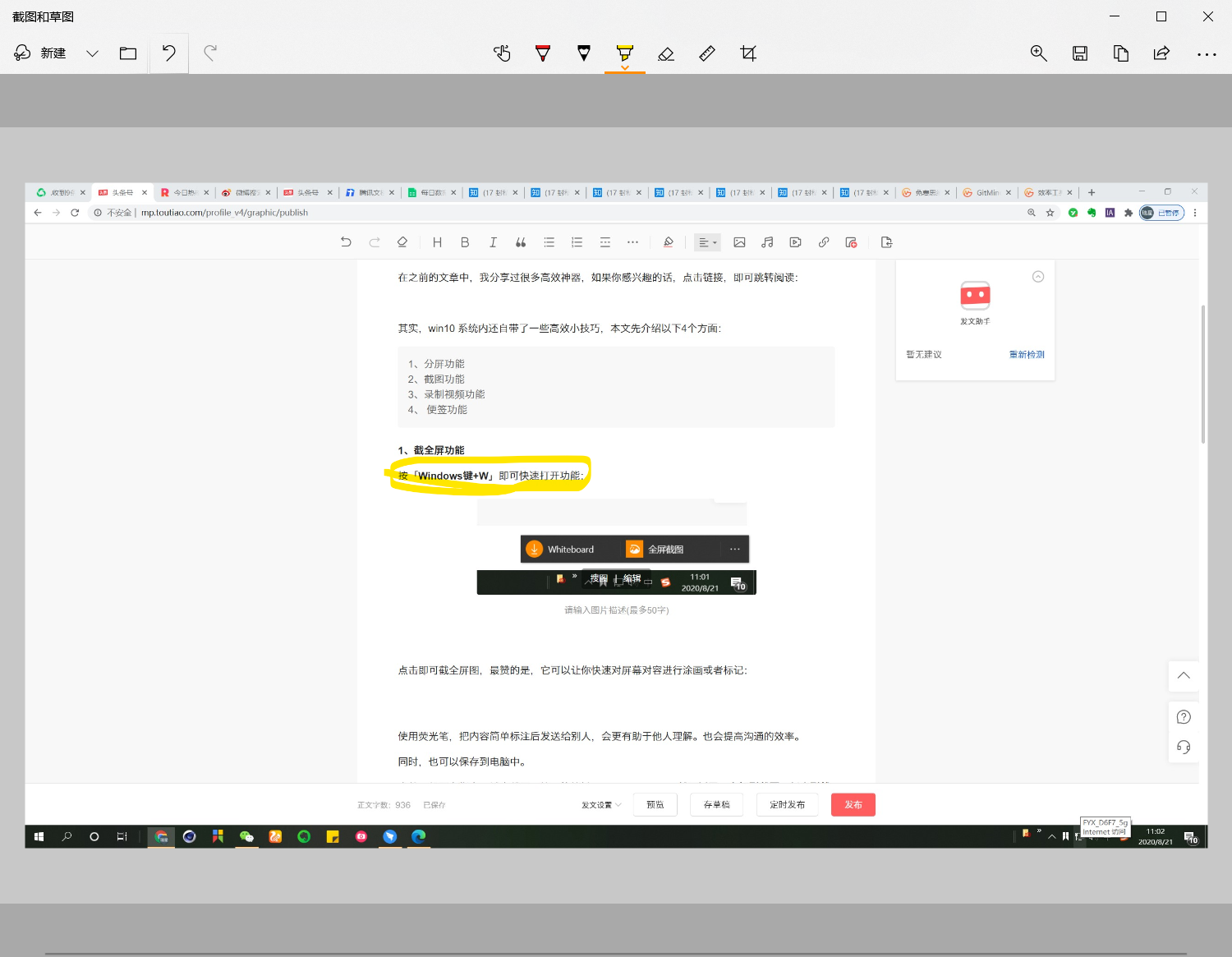 我一般不需要标记的话,都会用Win+SHIFT+S截图。非常方便