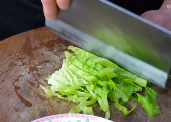 2、准备一颗生菜,将生菜一叶叶地给摘下来,生菜根不要,将生菜清洗两遍,清洗干净之后,将生菜叶子重叠放在一起,之后切成生菜丝,切好的生菜丝放入盘中备用。准备半盘豆芽,清洗干净放在一旁备用。