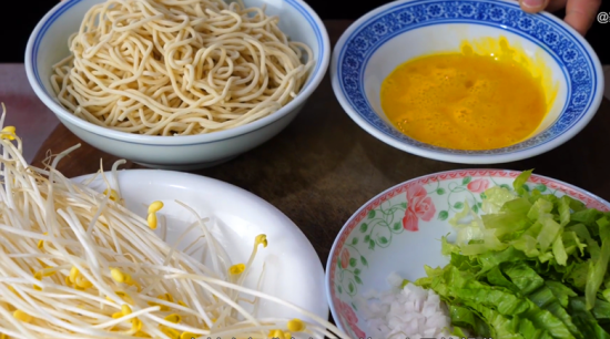 食材:面条 洋葱 鸡蛋 豆芽 青菜