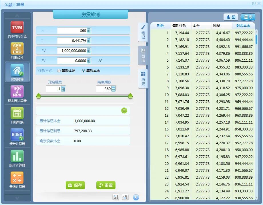 首月还款金额为7194.44元,以后每月的还款额逐渐减少,主要是每月偿还的利息逐渐减少,30年共还利息797208.33元。