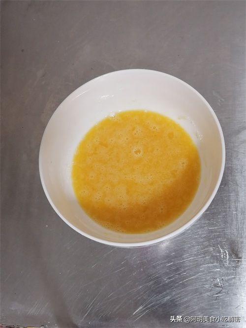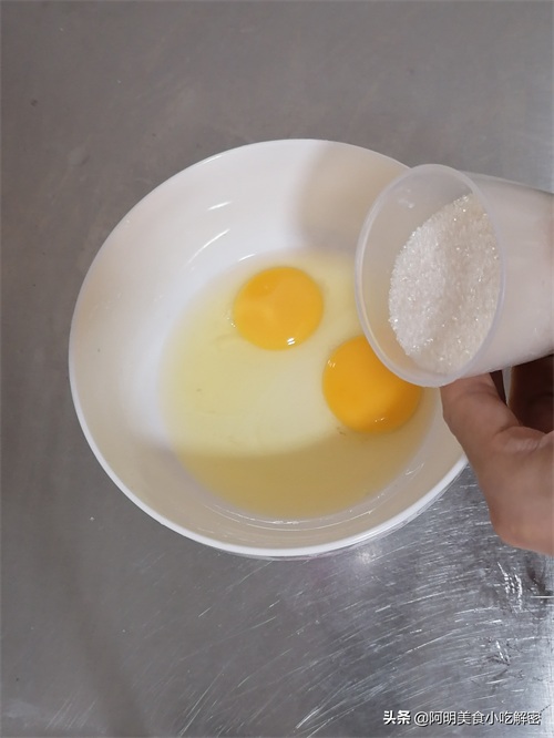 二、鸡蛋两个,倒入白糖100克搅拌至无颗粒