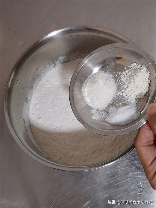 一、面粉500克,倒入奶粉15克、面包改良剂3克,盐2克搅拌均匀