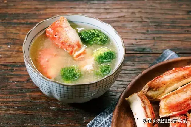5、用开水冲开味增酱,将蟹壳、焯过水的西兰花和适量盐加入汤中,小火煮8分钟,蟹汤完成。