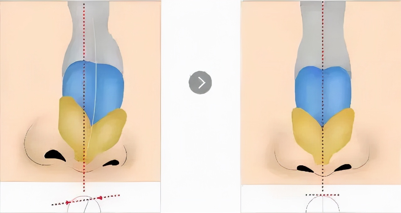 这种鼻梁下半的歪斜是软骨歪斜造成的,仅需要矫正歪斜的软骨,切断鼻中隔软骨与筛骨垂直板、犁骨、侧鼻软骨的连接,剪除多余的侧鼻软骨,恢复鼻中隔的中立位置。