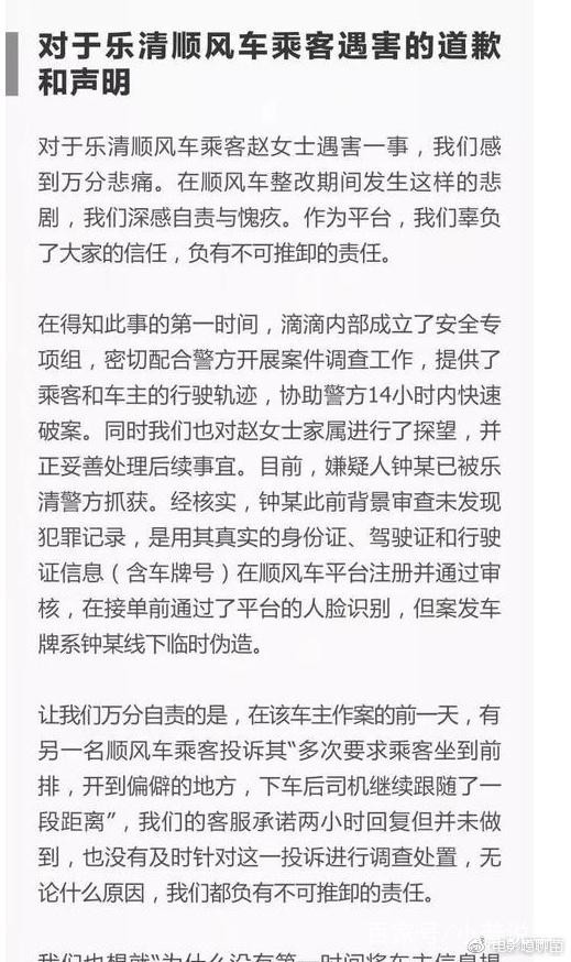 滴滴出行提到,在该车主作案的前一天,有另一名顺风车乘客投诉其“多次要求乘客坐到前排,开到偏僻的地方,下车后司机继续跟随了一段距离”,我们的客服承诺两小时回复但并未做到,也没有及时针对这一投诉进行调查处置,无论什么原因,我们都负有不可推卸的责任。
