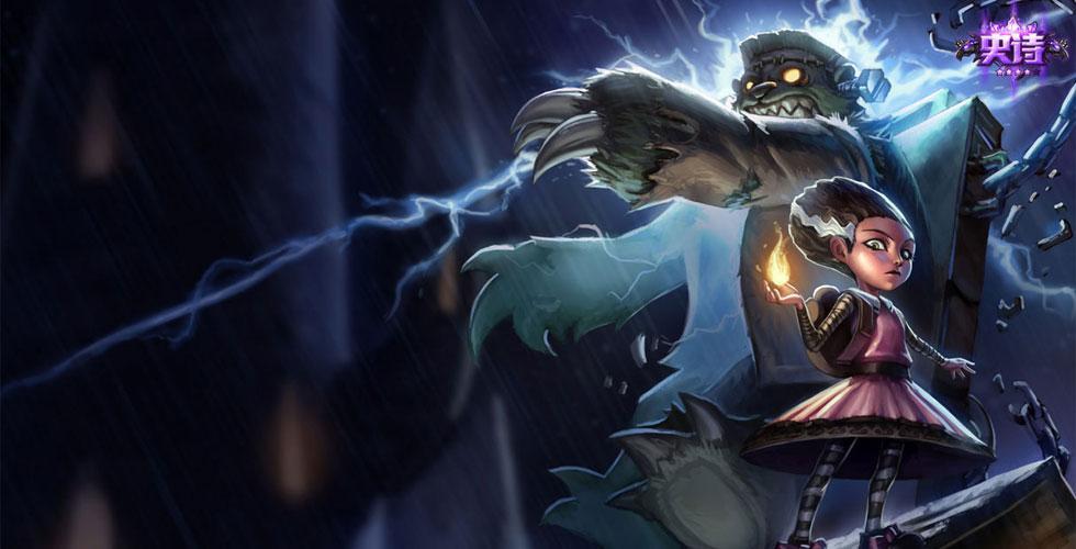 《科学怪人的新娘》是1935年环球电影出品的一部科幻/恐怖电影,被视为影史上最重要的恐怖电影之一,充满诡异、荒诞、超现实的迷魅气氛……好吧这段话是我百度的,说句实话我当时看到这个皮肤的时候也是一脸懵逼,不知道拳头为什么要搞这样的一款皮肤出来,售价仅为4500点券,风格也是说不出的诡异。不过,拳头也是一个喜欢致敬经典电影的公司,比如《勇敢的心·泰达米尔》《V字仇杀队·布兰德》之类的电影都有所表现,所以出这个皮肤也可以理解。这款皮肤目前已下架,不过可以在诸多抽奖活动中得到。