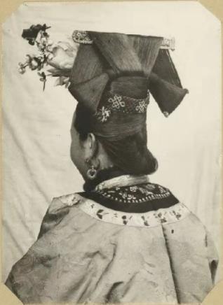 这种头上顶一个花瓶的发型被称之为顾姑冠。在蒙古族,只有王公贵族的女子才能佩戴这种冠。