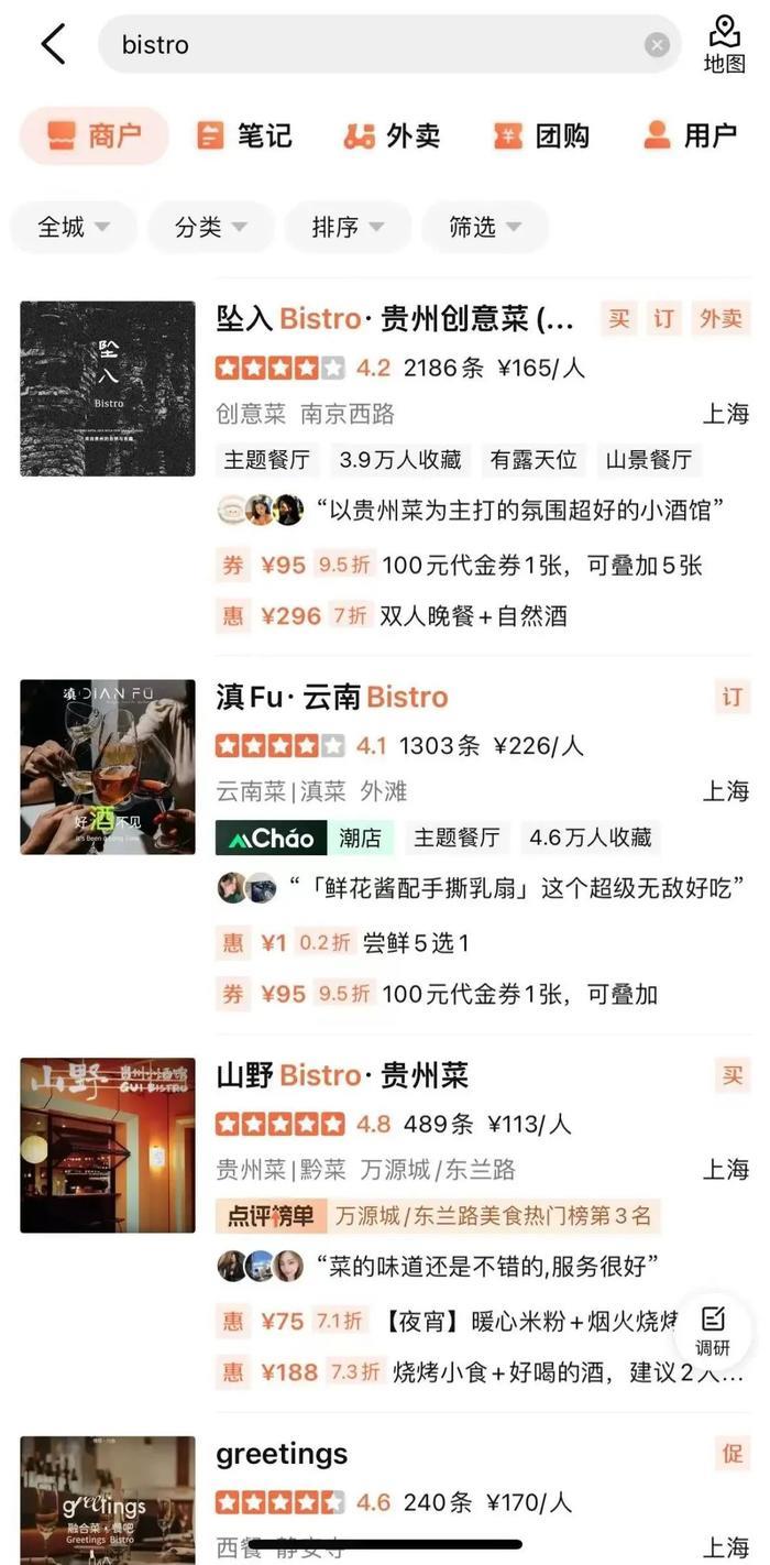 通过调研发现,现在消费者眼中的bistro价格并不低,在大众点评上搜索就可以发现,北上广深的bistro人均大多数在200-400元。